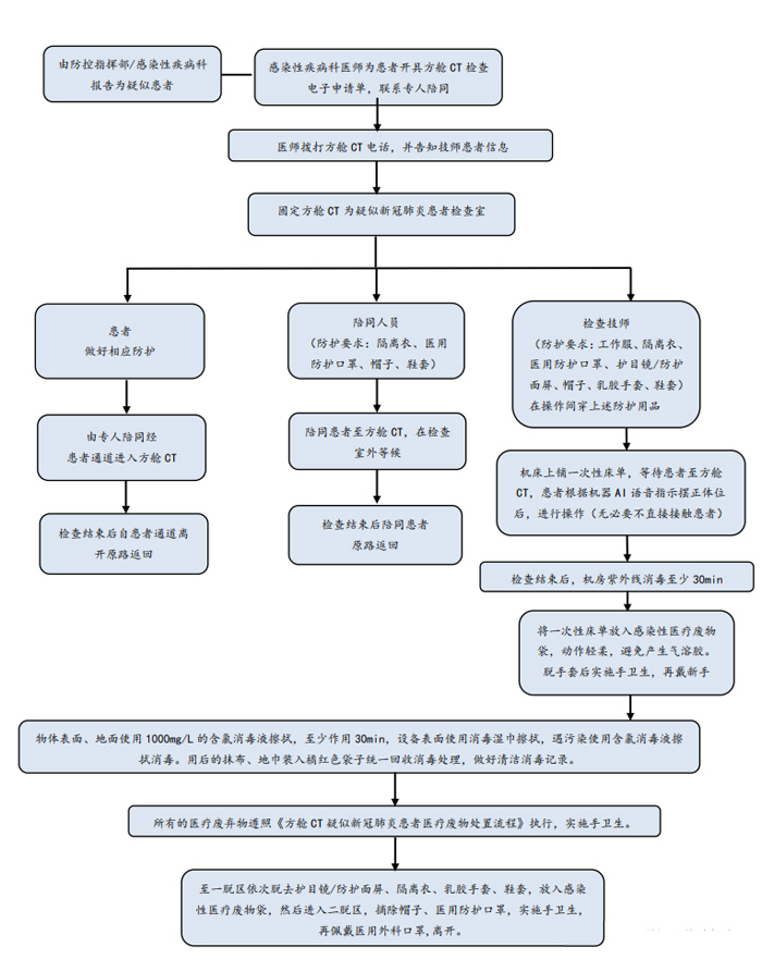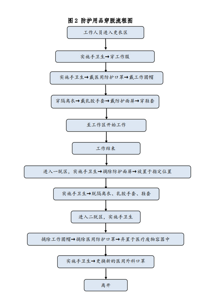 除X線電離防護(hù)外,方艙CT檢查需對操作技師、患者及家屬做相應(yīng)的防護(hù)。根據(jù)國家衛(wèi)生健康委辦公廳印發(fā)的《新型冠狀病毒肺炎防控方案》(第五版)[6]對于在新型冠狀病毒感染的肺炎疫情防控工作中不同的工作人員其防護(hù)等級是不同的。如是疑似患者,技師則執(zhí)行二級防護(hù)。方艙CT內(nèi),設(shè)置清潔區(qū)、一脫區(qū)、二脫區(qū)、免洗手消毒液、一次性防護(hù)服、一次性乳膠手套、鞋套、洗手液。技師需經(jīng)多次反復(fù)訓(xùn)練穿脫流程和檢查流程,并做好總結(jié),考察合格方可上崗。為此我科花費(fèi)了大量時(shí)間進(jìn)行了防護(hù)用品穿脫,消殺,接診流程的演練,并做總結(jié)和改進(jìn)措施。(附件1所示),防護(hù)用品穿脫流程如圖2所示。