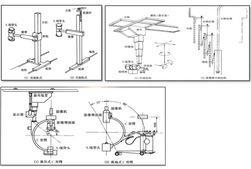 落地式:分為雙地軌式X線管組件支持裝置、天地軌式X線管組件支持裝置和攝影床一體化式X線管組件支持裝置。雙地軌式X線管組件支持裝置:立柱由兩條地軌支持,立柱固定在底座上,底座在雙地軌上滑動,帶動立柱和X線管組件在雙軌道上縱向水平移動。這種立柱支持方式對機房高度無特殊要求,安裝方便,缺點是地面軌道較多,顯得不整潔。天地軌式X線管組件支持裝置:立柱由一條地軌和一條天軌支持,其主體由立柱和連接桿組成。連接桿可上下伸縮,以在一定范圍內(nèi)適應不同高度的房間。天軌不承重,只起支持作用,安裝不太復雜,應用較多。這種結(jié)構(gòu)形式地面上只有一條軌道,較為整潔。懸吊式X線管組件支持裝置與前面落地式X線管組件支持裝置相比,結(jié)構(gòu)復雜、安裝難度較大、相對成本較高,但它能充分利用機房上部,具有運動靈活、操作方便、運用范圍廣的特點,所以特別適用于多功能X線攝影。懸吊式X線管組件支持裝置由固定縱向天軌、移動橫軌、滑車、伸縮架、橫臂、控制盒和X線管組件等組成。為適應各種不同X線特殊檢查而設(shè)計的,名稱因其形狀而來。C形臂的一端裝X線管頭和遮線器,另一端裝攝影轉(zhuǎn)換和記錄裝置如影像增強器、電視攝像機、點片照相機和電影攝像機等。C形臂式可以和懸吊臂式的裝置結(jié)合,組成懸吊式C形臂支持裝置可以與專用底座結(jié)合成落地式C形臂支持裝置。
