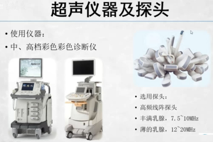 那么使用的設(shè)備呢要求是中高檔的彩色診斷儀。探頭型號(hào)非常的豐富,針對(duì)不同的器官采用不同的探頭。檢查乳腺使用高頻線陣探頭,穿透力分辨率,豐滿乳腺,采用7.5~10MHz探頭,薄的乳腺乳腺小的患者,采用12~20MHz探頭。乳腺的掃查方法有兩種,看個(gè)人的習(xí)慣,一是從上到下,左到右,移動(dòng)探頭逐一切面掃描探頭不要跳躍。采用聯(lián)網(wǎng)式,二是順時(shí)針或者逆時(shí)針?lè)较?,由乳頭為中心輻射狀掃描檢查。乳頭向外掃查,乳頭向內(nèi)掃查都可以。最重要的也是探頭不要跳躍,一定要采用聯(lián)網(wǎng)式的檢查。采用哪種方法,按照習(xí)慣選擇。乳腺的掃查的范圍有外向內(nèi)向外線內(nèi)線,乳頭中央?yún)^(qū)、向外延伸的腋尾區(qū)、腋窩、淋巴結(jié)四個(gè)象限。疊瓦式,剪草機(jī)式不放過(guò)任何位置。正常乳腺超聲標(biāo)準(zhǔn)斷面,經(jīng)乳腺腺體最厚處、通常于外上象限取得,在此段面測(cè)量乳腺厚度。