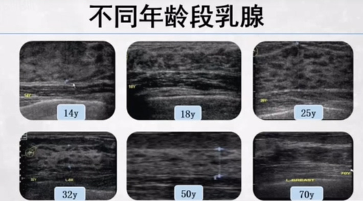 正常乳腺超聲聲像圖,乳腺超聲設(shè)備高分辨力超聲能夠清晰顯示乳腺及其周圍組織的解剖結(jié)構(gòu)??梢钥吹饺橄傧袤w,高回聲的皮膚層,低回聲的皮下脂肪層,然后是乳腺的腺體結(jié)構(gòu),那么后方的是乳腺腺體后脂肪,胸大肌,胸膜,乳腺的支撐機構(gòu)韌帶。乳腺掃查的時候乳頭乳暈區(qū)的掃查。乳頭的病變率還是有的。使用多量耦合劑觀察,對乳頭非常細致的掃查。觀察乳腺乳頭的情況跟改變。乳頭邊界清楚的外凸圓形結(jié)節(jié),均勻的中等回聲,后方都伴有聲影。乳腺導管與小葉,類似一小串葡萄。