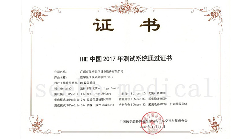廣州市顯浩醫(yī)療設(shè)備股份有限公司一直專(zhuān)注于醫(yī)療車(chē)設(shè)備及其配套產(chǎn)品的研發(fā)和生產(chǎn),其中公司生產(chǎn)的數(shù)字化X線采集軟件在2017年4月14日就成功通過(guò)中國(guó)醫(yī)學(xué)裝備協(xié)會(huì)醫(yī)學(xué)裝備信息交互與集成分會(huì)關(guān)于DR設(shè)備系統(tǒng)的測(cè)試,并榮獲 IHE中國(guó)2017年測(cè)試系統(tǒng)通過(guò)證書(shū)。